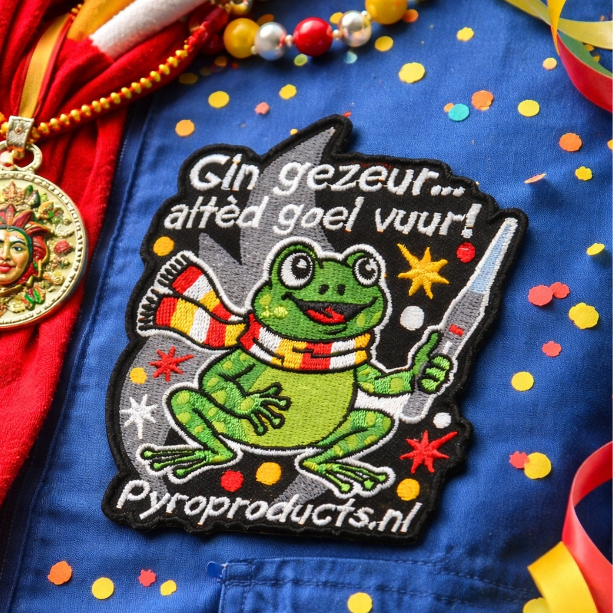 Geef je boerenkiel een echte Oeteldonkse uitstraling met dit exclusieve PyroProducts embleem. Het herkenbare ontwerp met de vrolijke kikker en de tekst Gin gezeur… altèd goei vuur! 🎭✨